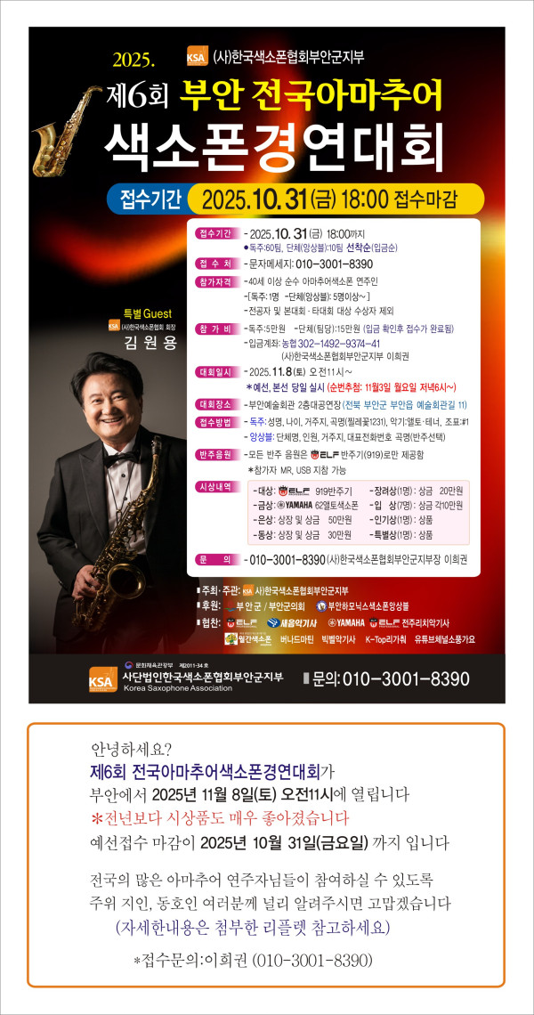 공연 | 제6회 부안 전국아마추어 색소폰경연대회 페이지 정보 작성자 최고관리자 쪽지보내기 메일보내기 자기소개 아이디로 검색 전체게시물 쪽지보내기 메일보내기 자기소개 아이디로 검색 전체게시물 작성일25-10-01 16:09 조회19회 댓글0건 다음글 목록 본문 제6회 부안 전국아마추어 색소폰경연대회가 2025년11월08일토요일 부안예술회관2층 대공연장(전북 부안군 부안읍 예술회관길11)에서 개최대오니많은 관심과 참석 부탁드립니다. 댓글목록 등록된 댓글이 없습니다. 다음글 목록