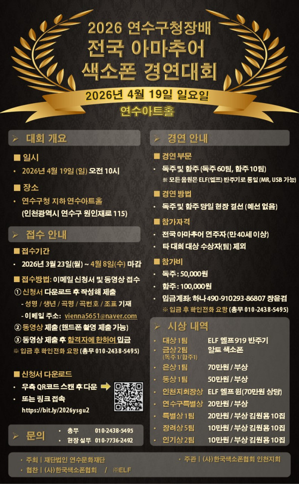 2026 연수구청장배 전국 아마추어 색소폰대회를 인천 지회에서 개최하게 되었습니다.