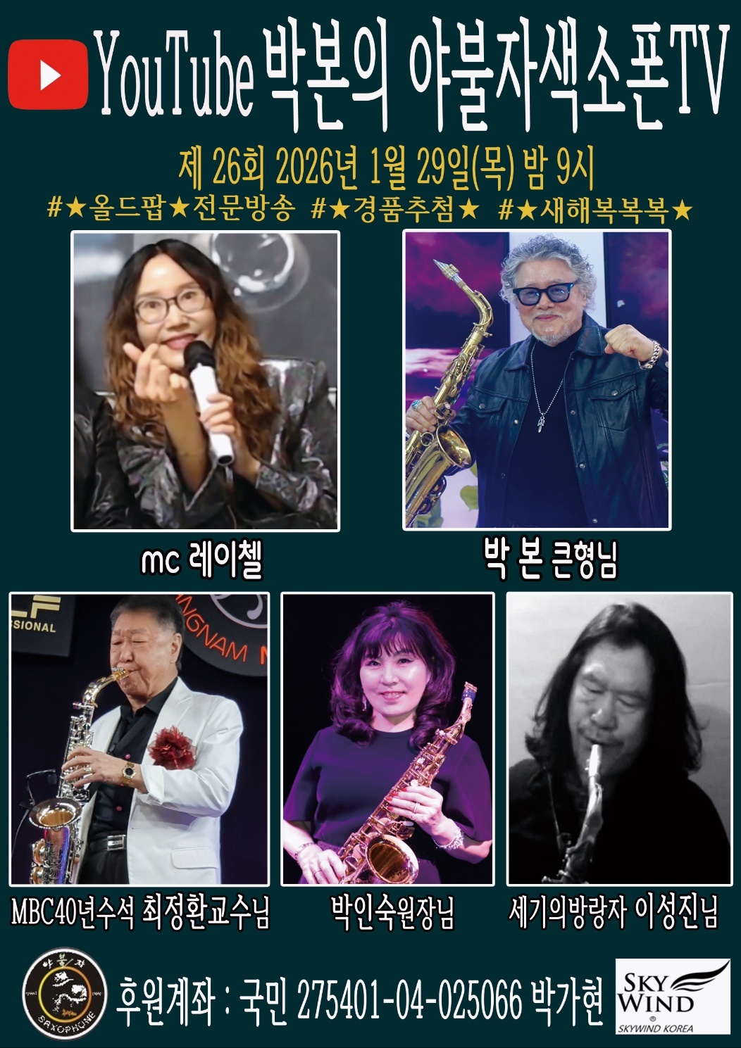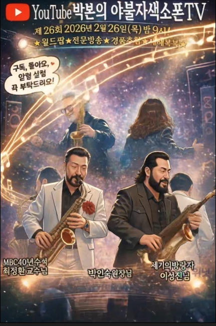 제26회 2026년2월26일(목) 밤9시 박본의 야불자색소폰TV 유투브 방송이 있으니 회원 여러분들의 많은 참여 부탁드립니다.