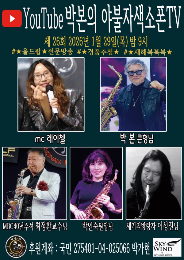 세미나 | 제6회 2026년1월29일(목) 밤9시 야불자색소폰TV 유투브 방송안내입니다 페이지 정보 작성자 최고관리자 쪽지보내기 메일보내기 자기소개 아이디로 검색 전체게시물 쪽지보내기 메일보내기 자기소개 아이디로 검색 전체게시물 작성일26-01-27 10:37 조회78회 댓글0건 이전글 다음글 목록 본문 2026년 첫 야불자색소폰TV 유투브 방송이입니다.(사)한국색소폰협회 회원 분들의 많은 시청 부탁드립니다.감사합니다. 댓글목록 등록된 댓글이 없습니다. 이전글 다음글 목록